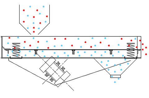 直線振動篩采用雙振動電機(jī)驅(qū)動,其兩電機(jī)軸相對篩面有一傾角,在激振力和物料自重力的合力作用下,物料在篩面上被拋起跳躍式向前作直線運動,從而達(dá)到對物料進(jìn)行篩選和分級的目的。